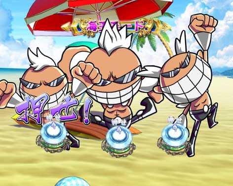 レインボー7以外の図柄揃いの初当りは6Rの「百裂チャレンジボーナス」。ラウンド中に発生する百裂チャレンジに成功すればVアタッ獲得で海王モード突入、失敗した場合は思い出モード突入となる。右打ち表示時にキレパンダが登場すれば百裂チャレンジ成功!?