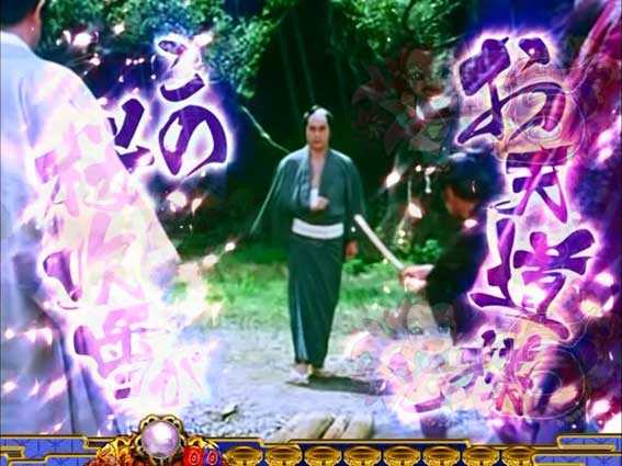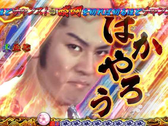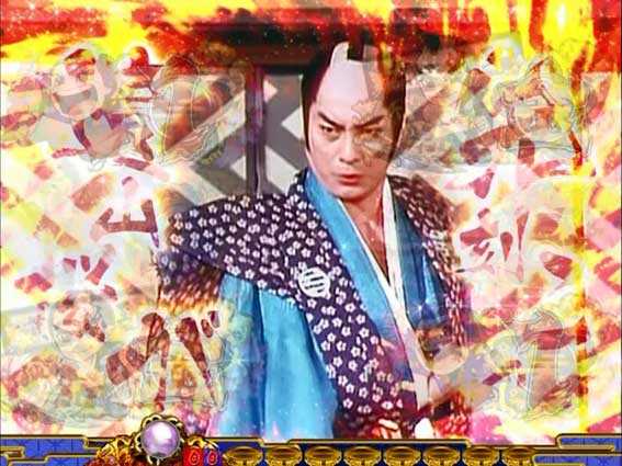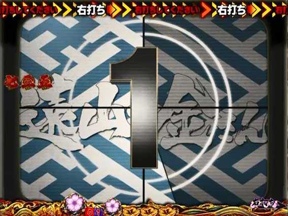 ロゴ役物が落下した後、襖が開いて「ご出座」の文字が出現すると発展。2パターンあり、どちらも高期待度となっている。また、ボタンPUSHで発生する演出の種類にも注目したい。