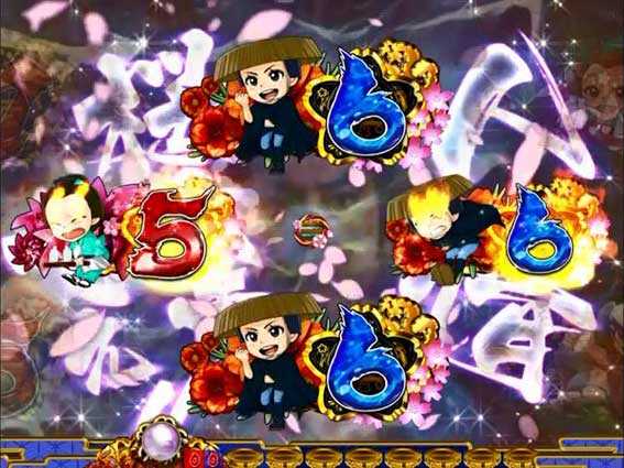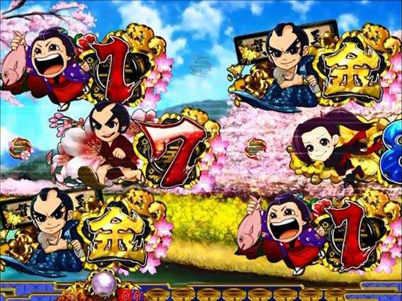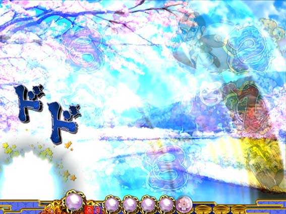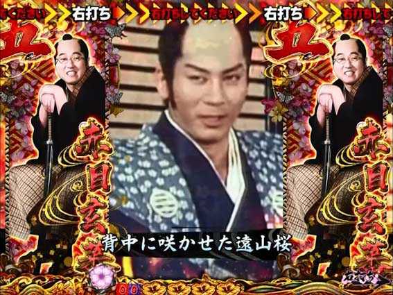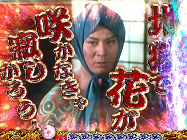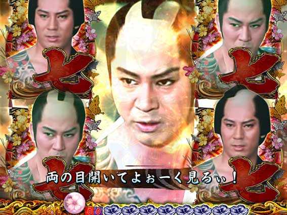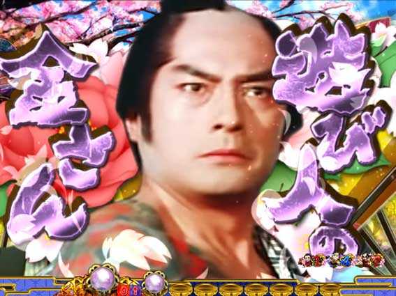 花びらとともに実写キャラが出現するステップアップ演出。金さんが登場して全画面になればチャンス!