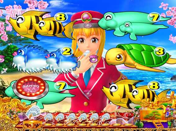 ジャパンモード中のスーパーリーチは、リーチ中のボタン押しで泡or魚群のどちらが出るかが重要。新演出の豪華絢爛リーチは大漁旗のカットインから発展し、図柄が桜吹雪に乗って画面手前へ押し寄せる。
