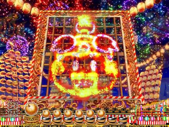 お祭りモードはスーパー発展時に、どの方向へ画面スクロールするかで発展先が決定。左へ向けば「図柄神輿リーチ」、右へ向けば「仕掛け花火リーチ」or「盆踊りリーチ」、上へ向けば大チャンスの「和太鼓リーチ」へ発展する。打ち上げチャレンジはどの方向からも発展する可能性があり、ボタン押しで花火が咲けば大当りだ!