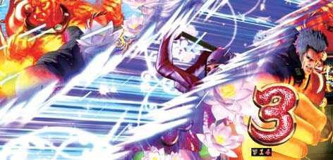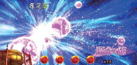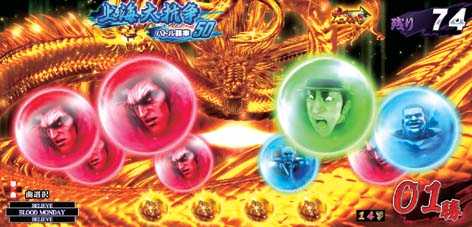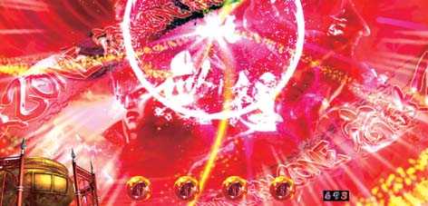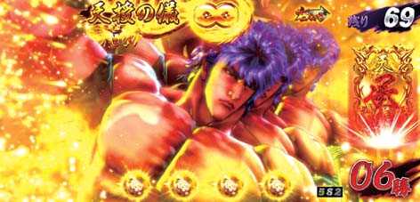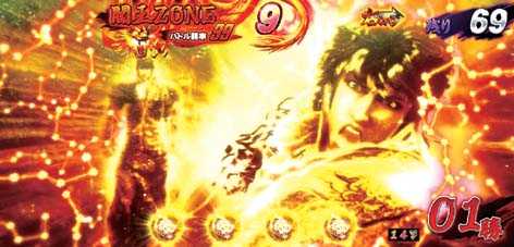 バトルリーチ発展時はノックアウトビジョンが飛び出し、拳志郎VS宿敵たちの死闘が展開。リーチは全4種類で、「VS劉宗武」なら大チャンスとなる。また、どのリーチも画面が金色に変化する天帰演出発生で期待度大幅アップ!