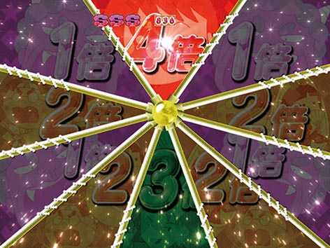 大当り後(オール7orS図柄除く)は倍倍チャンスでラウンド数が決定。ルーレットで1倍が選ばれれば「ボーナス」、2倍なら「2倍ボーナス」、3倍なら「3倍ボーナス」とラウンド数が増加していき、MAXの4倍なら16R分の出玉を獲得できる「4倍ボーナス」となる。ルーレットのマスがすべて4倍なら4倍ボーナス濃厚だ!