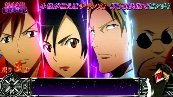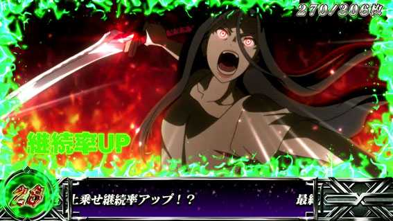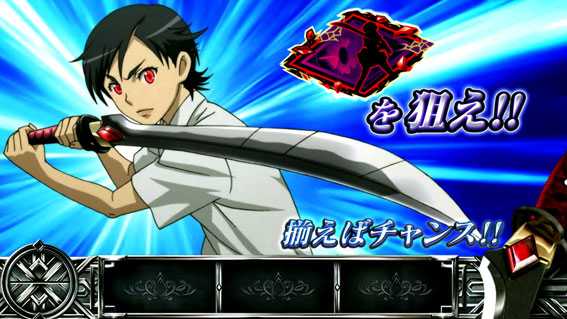 | 備考 | ★前半はBLOOD EYE揃い出現のたびに刀のオーラの色が昇格 ★後半バトル勝利でART当選、敗北ならボーナス終了後にCZ突入 ★ボーナス入賞時にSecret Story Bonusが発動すれば、上乗せ特化ゾーン「女王血戦」突入濃厚! ★バーサクモード発動ならART濃厚+大量ゲーム数上乗せの大チャンス!! |
