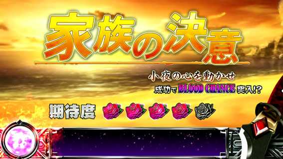 演出クリアでARTorボーナス。まごころの料理<決死の潜入作戦<希望へと続く光<家族の決意の順に期待度がアップする。また、赤タイトルや赤テロップなどの共通チャンスアップも存在。