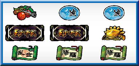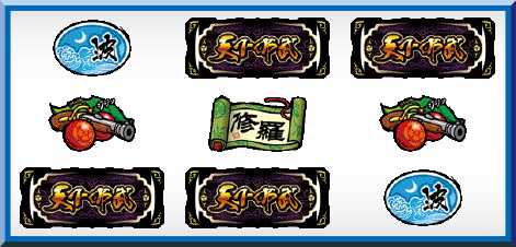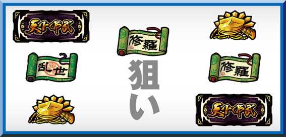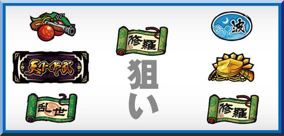 | 備考 | ★武将の種類で演出が変化(ゲーム性はどれも同じ) ★レア役成立時は家紋玉獲得や極・天雅モードに期待 ★家紋玉3個獲得で真・天雅モード突入抽選 ★全ゲーム数消化後は覚醒へ移行 |