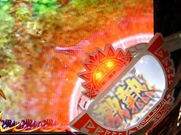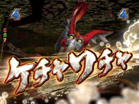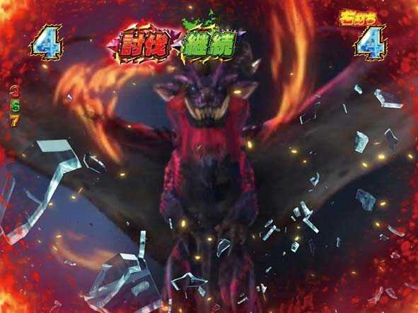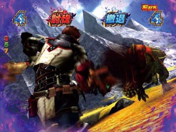 大狩猟リーチの押し合い演出でモンスターに押し切られると、討伐or撤退の「イビルジョー強襲リーチ」へ発展(剣ギミック発動ナシ)。怒り喰らうイビルジョーの攻撃を回避したり、討伐に成功すれば大当り+大狩猟モード継続だが、失敗した場合は大当り+リベンジチャンス突入となる。