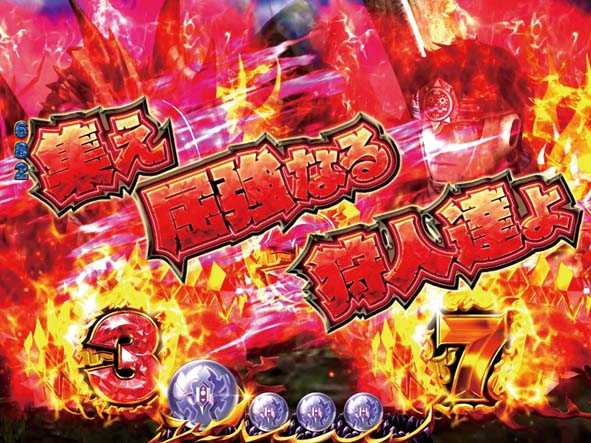 大狩猟リーチはハンターとモンスターの押し合い演出を、ハンターが制すればチャンス。その時点で討伐(大当り+大狩猟モード継続)or継続(リーチハズレ)となり、撤退(大当り+リベンジチャンス突入)の可能性はナシ。「押し切れ」画面の背景が赤だったり、ハンターが加勢した場合はハンターの押し切りに期待できる。