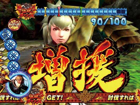 「クエストタイム」図柄停止で突入するチャンスゾーン。ハンターの攻撃でモンスターの体力ゲージを削り、見事討伐に成功すれば「部位破壊チャンス」をゲット。ハンター攻撃時の赤エフェクト、大タル爆弾Gをはじめとする強攻撃、仲間の増援など、多彩なチャンスアップが存在する。