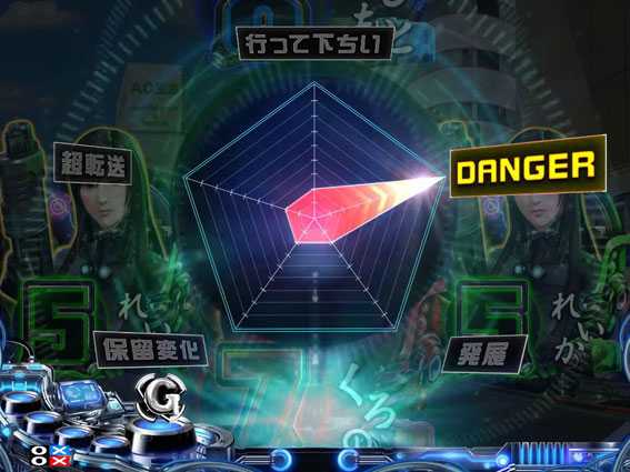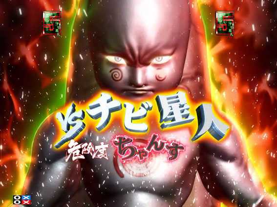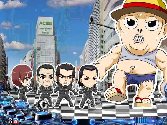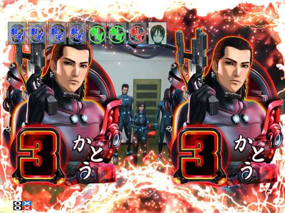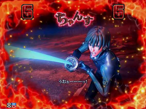 | トータル:17.3% ・テロップ赤:46.6% ・背景に赤い月:65.5% ・建物の看板に「ちゃんす」:63.4% ・建物の看板に「激あち」:93.3% ・終盤に「GANTZ」カットイン:47.6% ・GANTZフラッシュ発生:87.8% サプライズボタン:超激アツ |