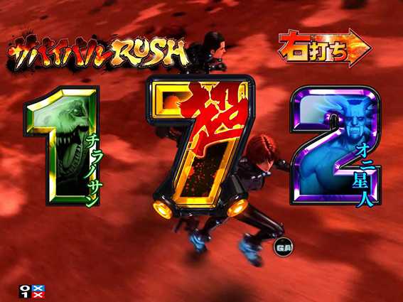 通常時に7以外の図柄が揃うと、GANTZ BONUSかREGULAR BONUSかを決める演出が発生。「GANTZ BONUS」のロゴが「REGULAR BONUS」を押し出せば6R確変当選&サバイバルRUSH突入濃厚だ。