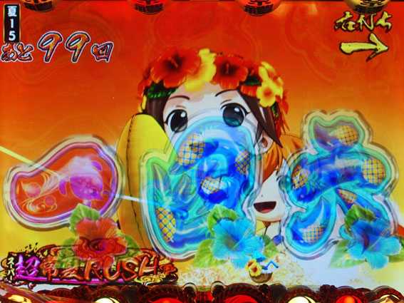 トロピカルチャレンジで当たると発生。4Rの確変大当りで、終了後は電サポ80回転STの常夏RUSHに突入する。