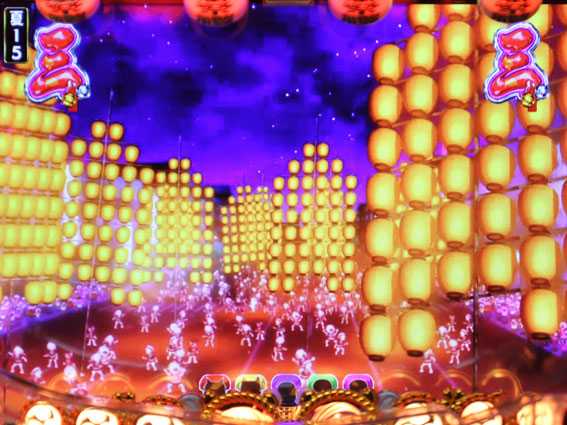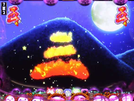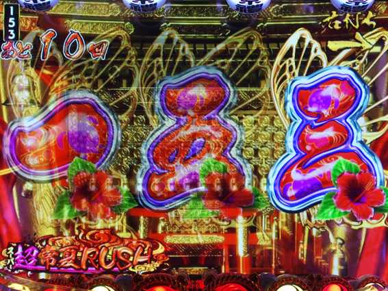 七図柄が揃う、または電サポ中に当たると発生。16Rの確変大当りで、終了後は電サポ130回転STの超常夏RUSHに突入する。