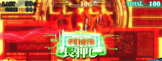 PUSHボタンの長押しでゲーム数を上乗せ。長押し時のエフェクトの色が重要で、青<黄<緑<赤<虹の順に大量上乗せが期待できる。