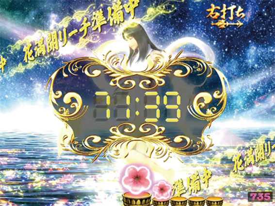 次回大当りまで電サポが続く確変モード。大当りの多くがノーマルリーチor花満開リーチ経由で発生し、後者ならチャンス。また、電サポ中専用の歴代花満開リーチは、発生時点で確変大当り濃厚だ!