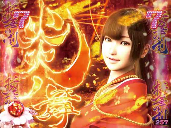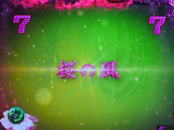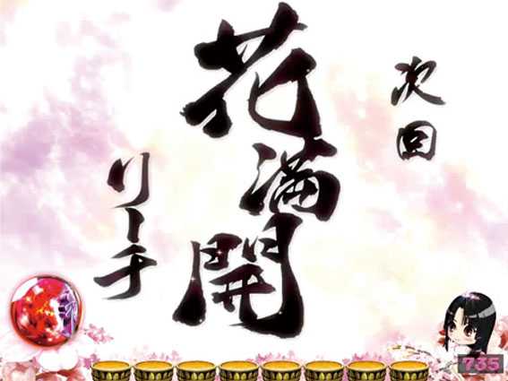 | 桜華の刻予告 | ■「さあ、参りましょう」・・・29.0% ■「花満開」・・・83.0% ■「おめでとうございます」・・・大当り濃厚 |