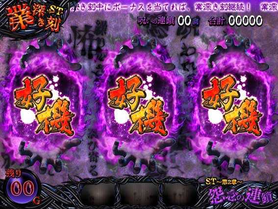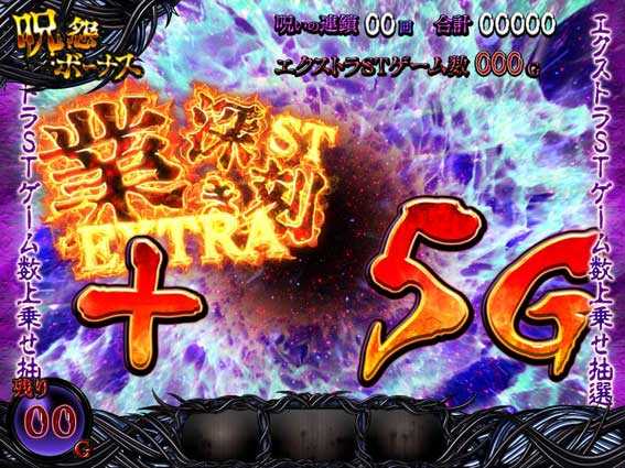 呪怨ボーナスや呪縛ボーナス中にエクストラSTのゲーム数を獲得すると、ボーナス終了後は獲得したゲーム数分のエクストラSTがスタート。消化中にボーナスを引けば、半数が呪怨ボーナスとなるぞ。なお、エクストラSTが終了すると業深き刻が50Gの状態からスタートする。