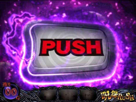 ART終了画面でPUSHボタンを押すと、筐体上部左右にある呪いランプに青い「呪」の文字が出現。「呪」の光り方や点灯時間には何かを示唆する秘密がある!?