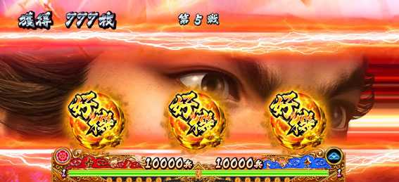 自軍兵力が0になると移行。液晶では敵武将との一騎打ちが展開し、勝利すればART継続となる。レア役が成立したり、創造ボードで宝玉が揃うと引き戻しのチャンスだ。