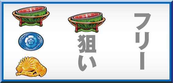 | 備考 | ★的を多く射抜くほどARTのチャンス ★家紋付きの的を射抜けばART当選 ★3択ベル押し順正解、MBの一部、 MB中ベルで的を1個以上射抜く ★レア役なら家紋付きの的を 直撃するチャンス |