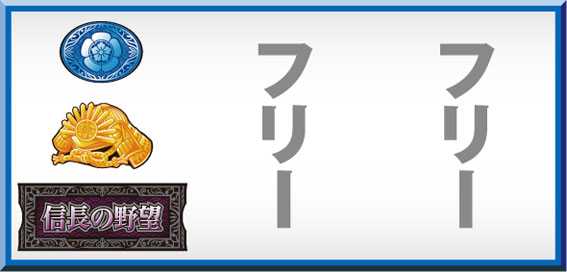 | 備考 | ★開始画面で赤7が揃うと野望チャンス発生 ★開始画面で青7が揃うと真野望チャンス発生 ★自軍兵力を決定or獲得 ★レア役は自軍兵力をさらに上乗せ |