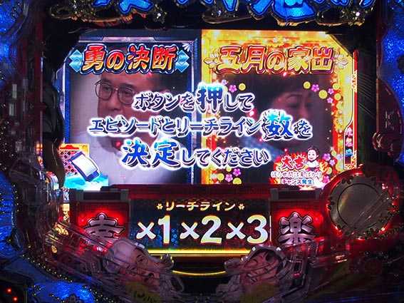 本機は、「リーチ相続システム」という一味違った連続演出を採用している。画像のように、相続(連続)するとリーチラインが1ライン増加し、最大3ラインまで増えることがある。もし、3ラインまで増えればリーチが3回チャンスとなるので、ただ連続するだけではなく期待感がそのまま上乗せされるのだ。