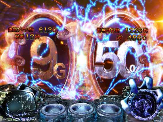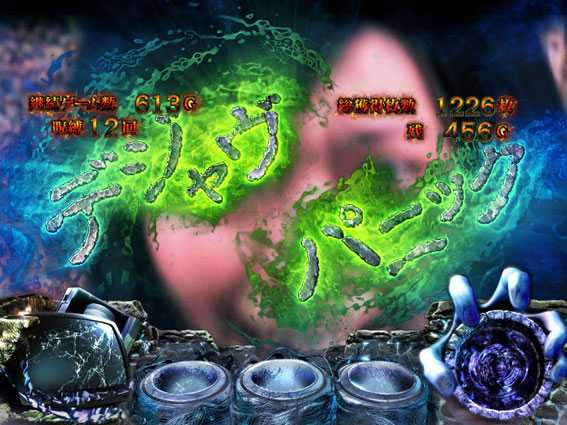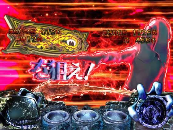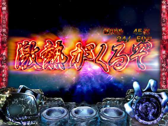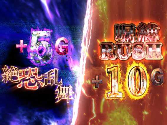 レア役成立を機に、呪眼役物&呪いの手役物が落下すると突入。ベルとレア役のヒキ次第では、絶恐乱舞自体のロング継続にも期待できるため、必然と大量上乗せのチャンスとなる。