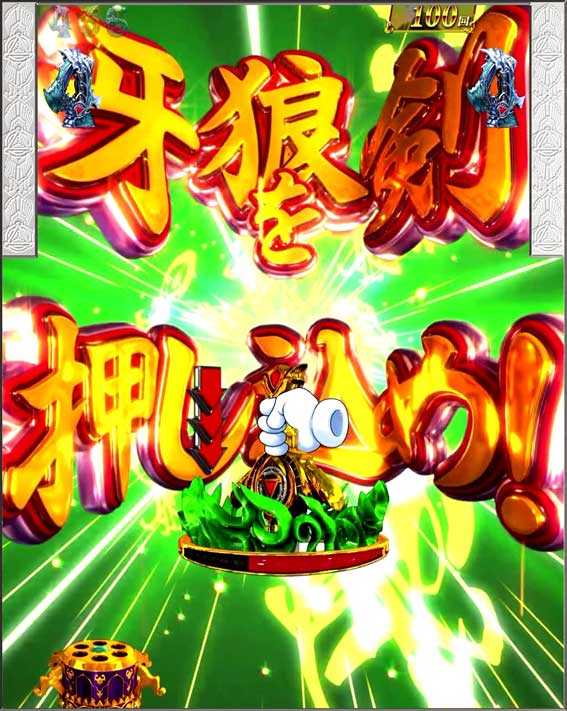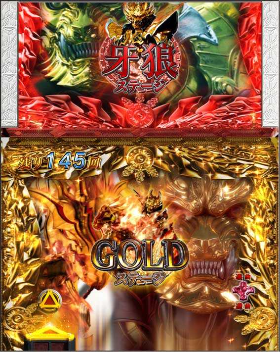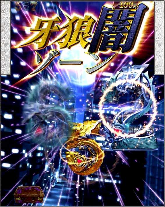 「牙」「狼」「翔」図柄停止で発展する特殊リーチ。「初代枠パターン」と「金色枠パターン」の2種類があり、どちらのパターンも最終的に液晶内で玉がV入賞すれば大当りとなる。