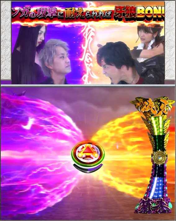初回銀図柄揃いで発生。バトルで流牙と莉杏が倒れなければ牙狼BONUSとなり4R確変&ST突入、敗北で漆黒BONUSとなり4R通常&時短突入(逆転演出発生の可能性もあり)。