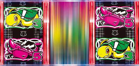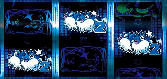 中リール中央にチビザメ図柄停止でスーパー発展&期待大! チビザメ停止時に図柄が赤点滅するとさらにアツい!!