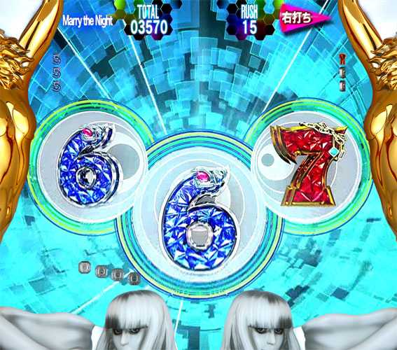 | 「Marry the Night」 | ■トータル・・・29% ■通常タイトル・・・17% ■赤タイトル・・・43% ■フルーツ柄タイトル・・・95% ■GAGA背景(強)・・・71% ■モチーフ落下&役物赤・・・43% ■サブリミナルチャンスアップ&役物赤 ・・・70% ■GAGA文字赤・・・35% ■GAGA文字金・・・99% ■チラGAGA(弱)・・・95% ■チラGAGA(強)・・・大当り濃厚 ■HYPER GAGA ZONE発生・・・89% |