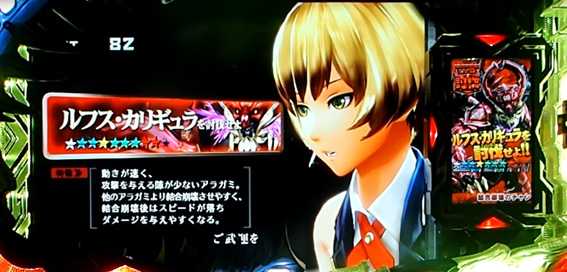 | 備考 | ★バトル型ART ★勝利ストック(セットストック)抽選あり ★アラガミのHPが0になれば討伐成功 ★基本的にベルやレア役で アラガミにダメージを与える ★討伐成功後は12Gのストーリーパートを 経て次セットに突入 ★アラガミの種類や消化中の攻防パターンなどで 討伐期待度が変化 ★勝利ストックやブラッドアサルトを 獲得できる特化ゾーンあり |