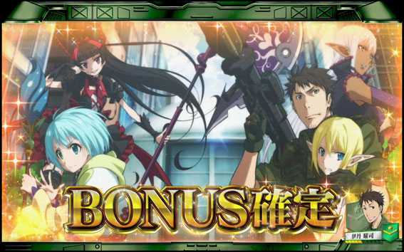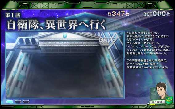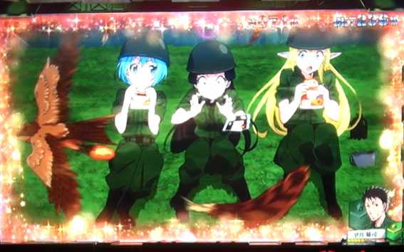 人気テレビアニメ「GATE 自衛隊 彼の地にて、斯く戦えり」とのタイアップ機。スペックはA+RTで、次回ボーナスまで続く無限RTも搭載。RT突入のメイン契機はCZで、CZ中はGATE図柄が揃うとRTorボーナス濃厚。CZ中にスペシャルリプレイが揃うと無限RT突入濃厚だ。また、演出カスタム機能もあり、選んだキャラに応じて演出の発生頻度や再生ボイスなどが変化する。