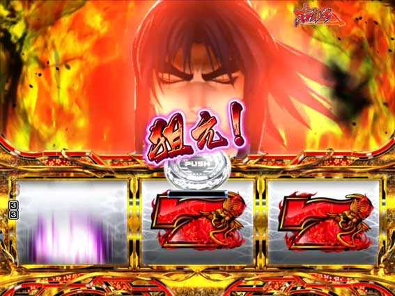 通常時に赤図柄が揃うと発生する5R確変大当り。終了後は甲撃の刻に突入する。