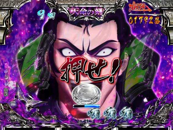 通常時に青or緑図柄が揃うと発生する5R大当り。ラウンド中のボタンPUSH演出に成功すれば5R確変となり甲撃の刻へ突入。失敗すると5R確変or5R通常となり天命の刻へ移行する。