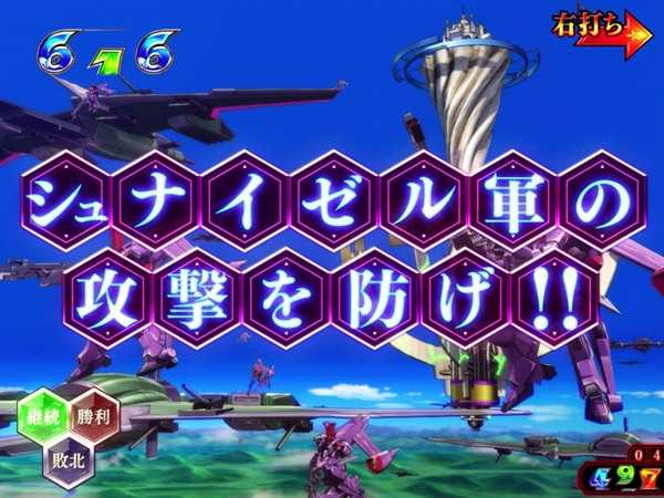 偶数図柄テンパイから発展。攻撃を防御できれば確変大当りor確変継続、失敗すると4R大当り=確変終了のピンチだ。