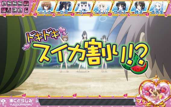湯ぐどらしるタイム中は、女の子カードが揃うとキスゲットとなり、液晶上部の女の子キャラがキス顔に変化。妄想ちゃれんじ突入までに多くの女の子とキスできるほど、ART継続期待度もアップする。例えば、湯ぐどらしるタイム終了までに3人とキスできれば、妄想ちゃれんじでは4人とキスすればART継続となるぞ。