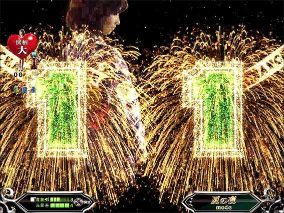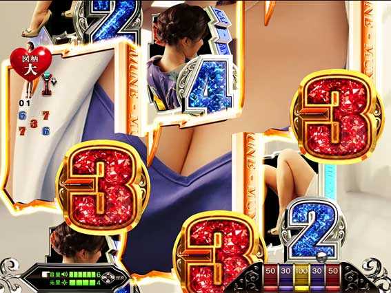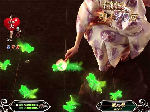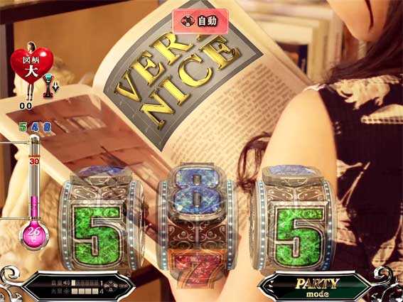 変動中にVコンを引くと図柄無しモードに変更できる。モード中は図柄が消え(正確には液晶左側に小さく表示)、演出を最大限に堪能できるようになるぞ。また、図柄無しモード限定で、液晶左上にいる女の子が水着になれば超激アツだ!