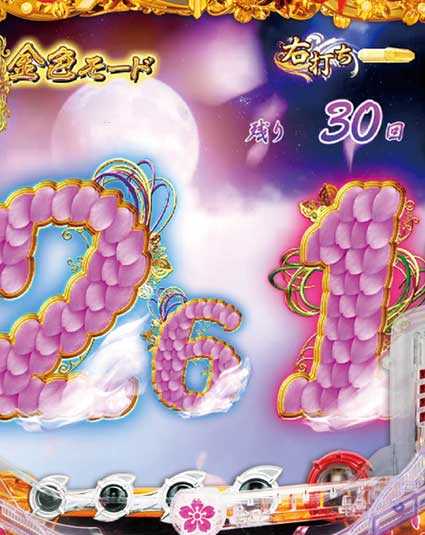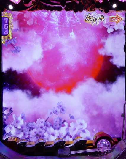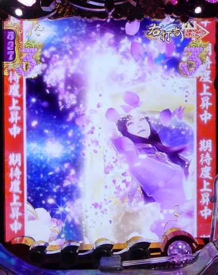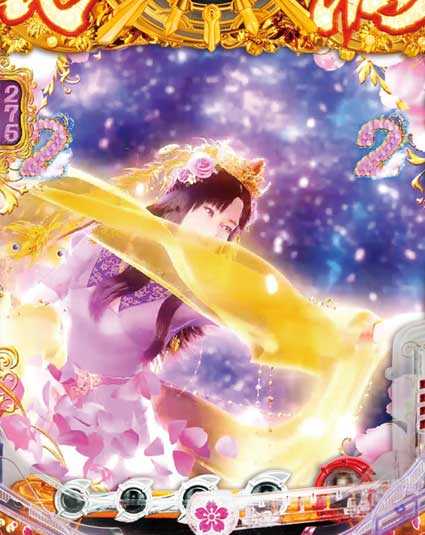 回転中に液晶左の枝役物が動き、画面内に花びらが舞う予告。花びらの色が赤、または激しく回転するように花びらが舞う強背景だとチャンスだ。