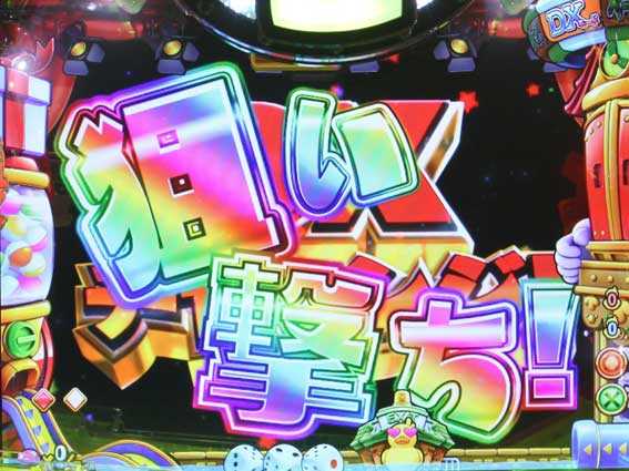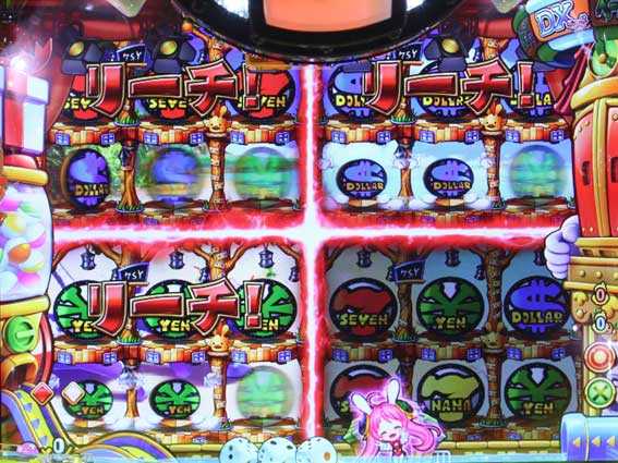 ぐるぐるバットリーチハズレから発展する高信頼度リーチ。ナナティーがハンマーで図柄をブッ叩いて大当りを狙うぞ。なお、ハンマーの色が赤だとチャンスで、キャラがドルシーだと大当り濃厚だ!