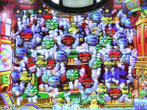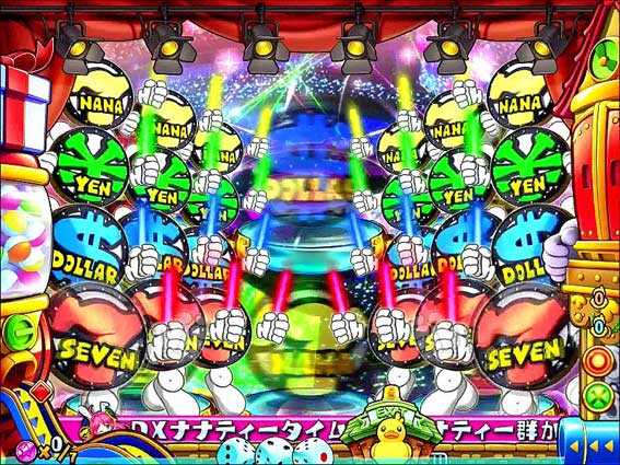 右下のコインくんがバットを使ってその場でぐるぐる回り、ふらふらしつつも耐えて立ち続ければ大当りとなる。失敗してもナナティーが登場すればナナティーリーチに発展する。