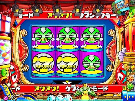 下段のコインくんがジャンプで上段図柄を変化させて大当りを狙うリーチだ。