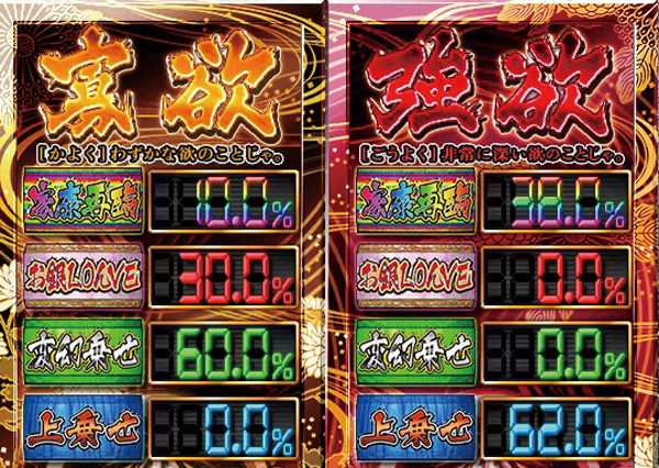 「寡欲」or「強欲」を選択した後は、だるま落としによって上乗せパターンが決定する。この時、金ハンマーを使用したり、バッター慶喜が登場したら家康再臨の大チャンス! 家康までぶっ飛ばした場合は、水戸革命突入濃厚となるぞ!! また、今作でも「倍ちゃんっす」は健在。今作では上乗せゲーム数がゾロ目の場合に突入し、倍ちゃんの捕獲成功率は50%オーバー。さらに、成功後のゲーム数がゾロ目の場合(111G→222Gなど)、再び倍ちゃんっすに突入するため、超大量上乗せの可能性もアリ!