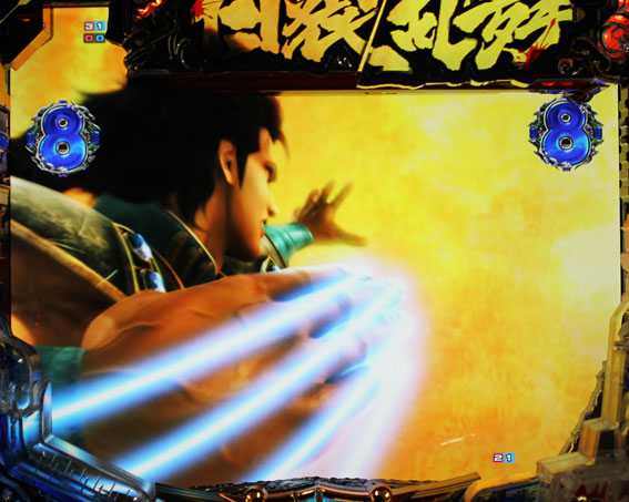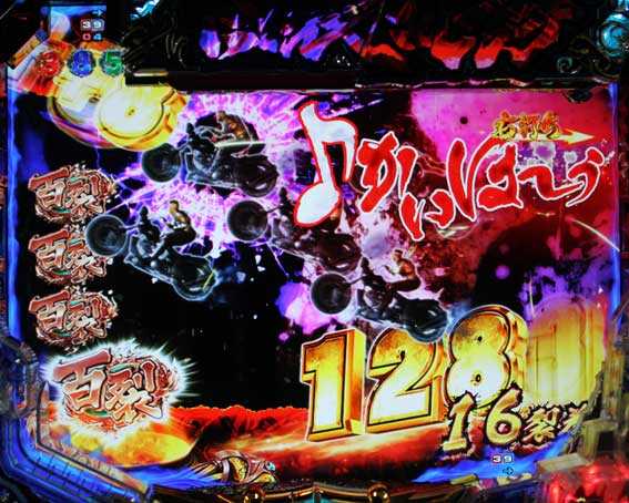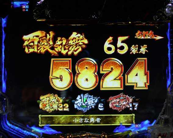 初当りが百裂乱舞BONUSだった場合、16R分の出玉獲得後は小当りRUSHへ移行するが、液晶では百裂乱舞BONUSがそのまま継続する。小当りRUSH中は百裂アイコンを獲得し続ける限り終わることがなく、バトルに発展して負けるまで続くぞ。小当りRUSH中の銀アイコン獲得時は、アタッカーがショート開放となるぞ。乱世は確変(小当りRUSHではない)or時短の電サポモードで、消化中に超乱世モードへ移行した場合は確変状態濃厚となる。