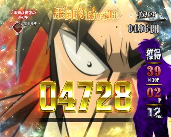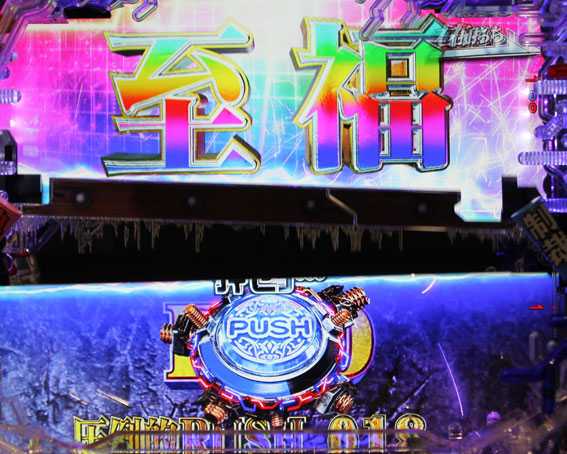 通常時の大当りの多くはこの圧倒的ボーナスとなる。消化中は、ラウンド終盤でギロチン役物落下を煽る演出が発生し、落下で12R通常大当り、落下しなければ12R確変大当り&圧倒的RUSH突入。ラウンド開始時に無敵ZONEが発動した場合は、その時点で16R確変&圧倒的RUSH突入濃厚だ。