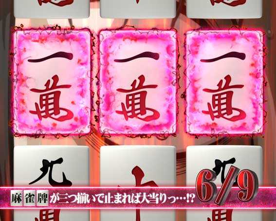 3牌の順子(一萬、二萬、三萬など)が揃えば後半へ。同一図柄揃いで大当り!