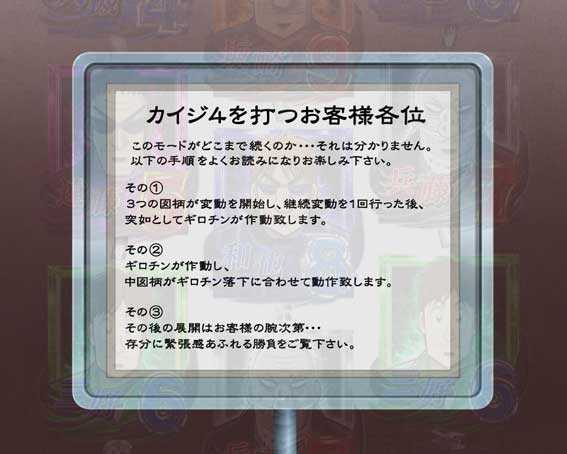 | リーチ後演出 | ・カイジタバコ予告 ・ギロチンクラッシュ ・運否天賦チャンス |