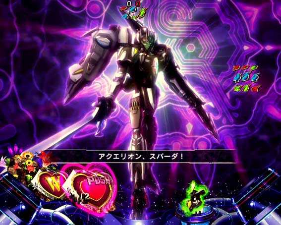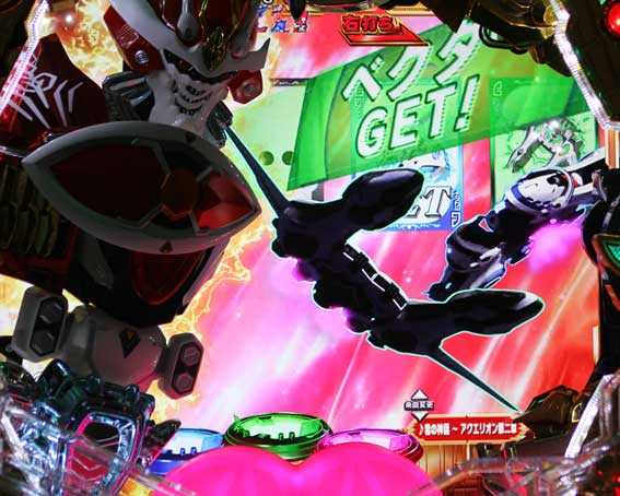 2005年に放送された「創聖のアクエリオン」と、2012年に放送された続編「アクエリオンEVOL」の2作品とタイアップしたマシン。スペックは大当り確率1/319.7、確変継続率65%・次回までのループタイプで、電サポ中は約2400個獲得できる16Rの割合が40%もある。さらにアタッカー付近には「エクスタシーポケット」も搭載されている。
