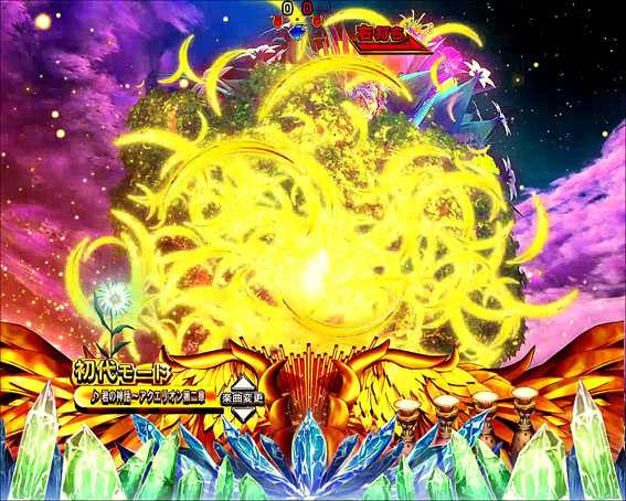 初代モード中に図柄が揃うと、ソーラーアクエリオンが祈願拳で確変昇格を狙う再抽選演出が発生。祈願拳ではなく祝福拳が発生すれば昇格濃厚だ!