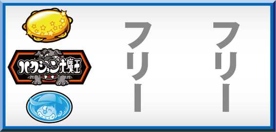 | 備考 | ★カンちゃんがくしゃみをすれば RT突入濃厚 ★くしゃみをしたゲームでは RT40G獲得をかけて目押しに挑戦 ★目押し成功で40GのRT、 失敗で20GのRTに突入 ★パパ&ママ出現時は3連魔王狙いでも 目押しさえ成功すればRT40Gゲット ★くしゃみが発生せず10Gを消化すると 通常時に戻る |
